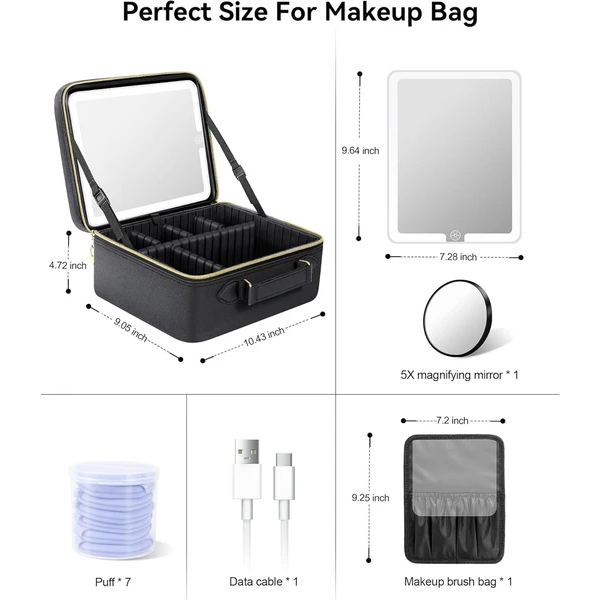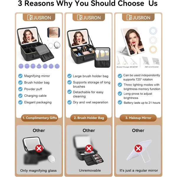 ��[NEW DESIGN AND UPGRADES]JUSRON makeup bag is equipped with a smooth water-drop zipper for effortless opening. The handle has been upgraded to a circular design that aligns with ergonomics, reducing pulling pressure. To cater to travel needs, we've added a luggage elastic band for convenient carrying. The included 5X magnifying mirror is undoubtedly more practical than 10X, and powder puffs set are provided for easy replacement.